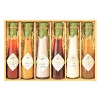 イタリアントマトのイタリアンドレッシング、信州林檎仕立て胡麻ドレッシング、2種のイタリア産チーズ仕立てシーザーサラダドレッシング、甘味噌仕立て木の実ドレッシング、特選醤油仕立てノンオイル白だしドレッシング、瀬戸内の花藻塩仕立てノンオイル塩レモンドレッシング各120ml×1