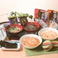 ふかひれスープ160g×2、紅ずわいがにスープ160g×1、あわび入お吸い物4g、松茸のお吸い物4.2g×各4、紅ずわいがにほぐし身55g、白子のり(8切5枚)×各3